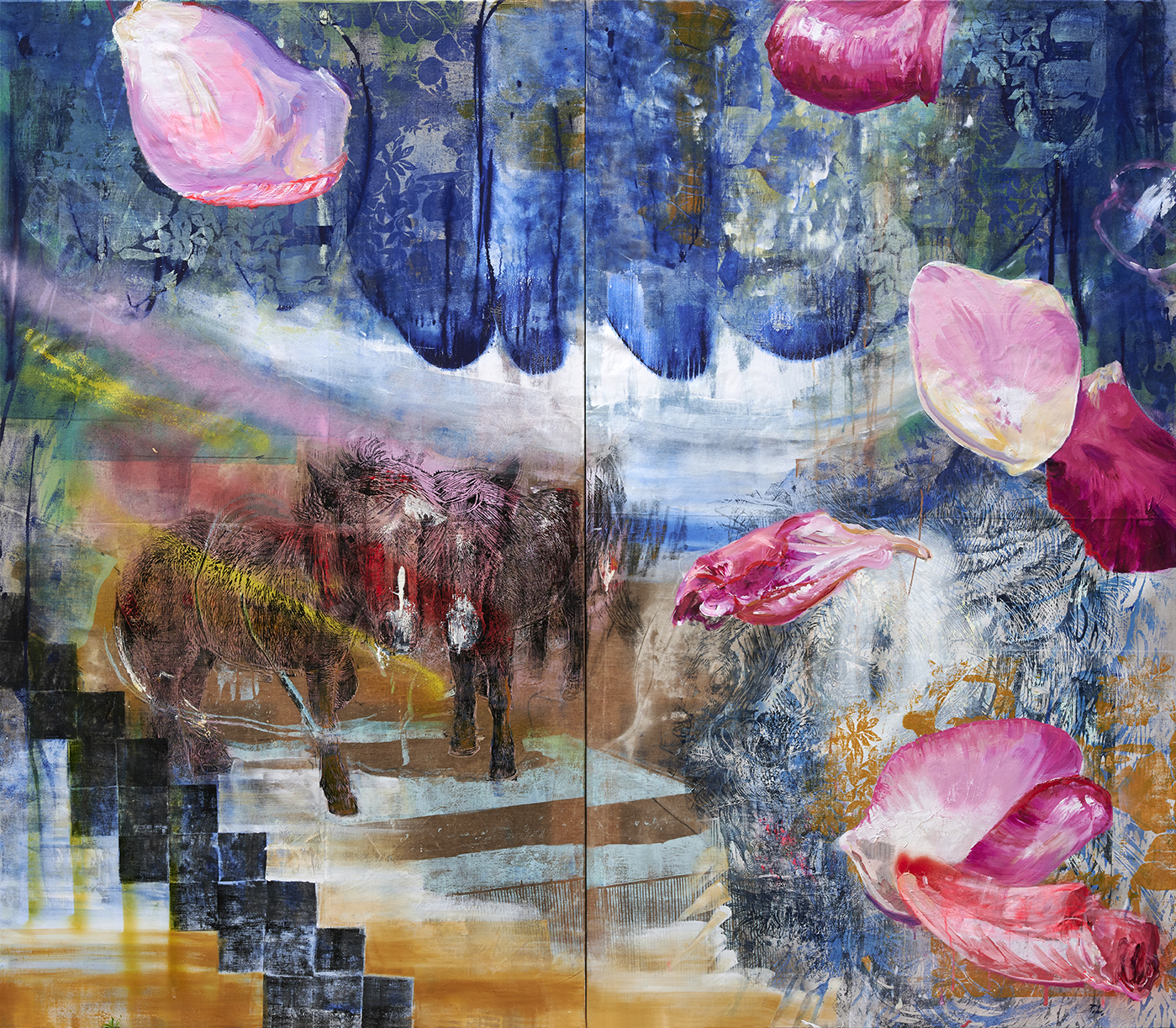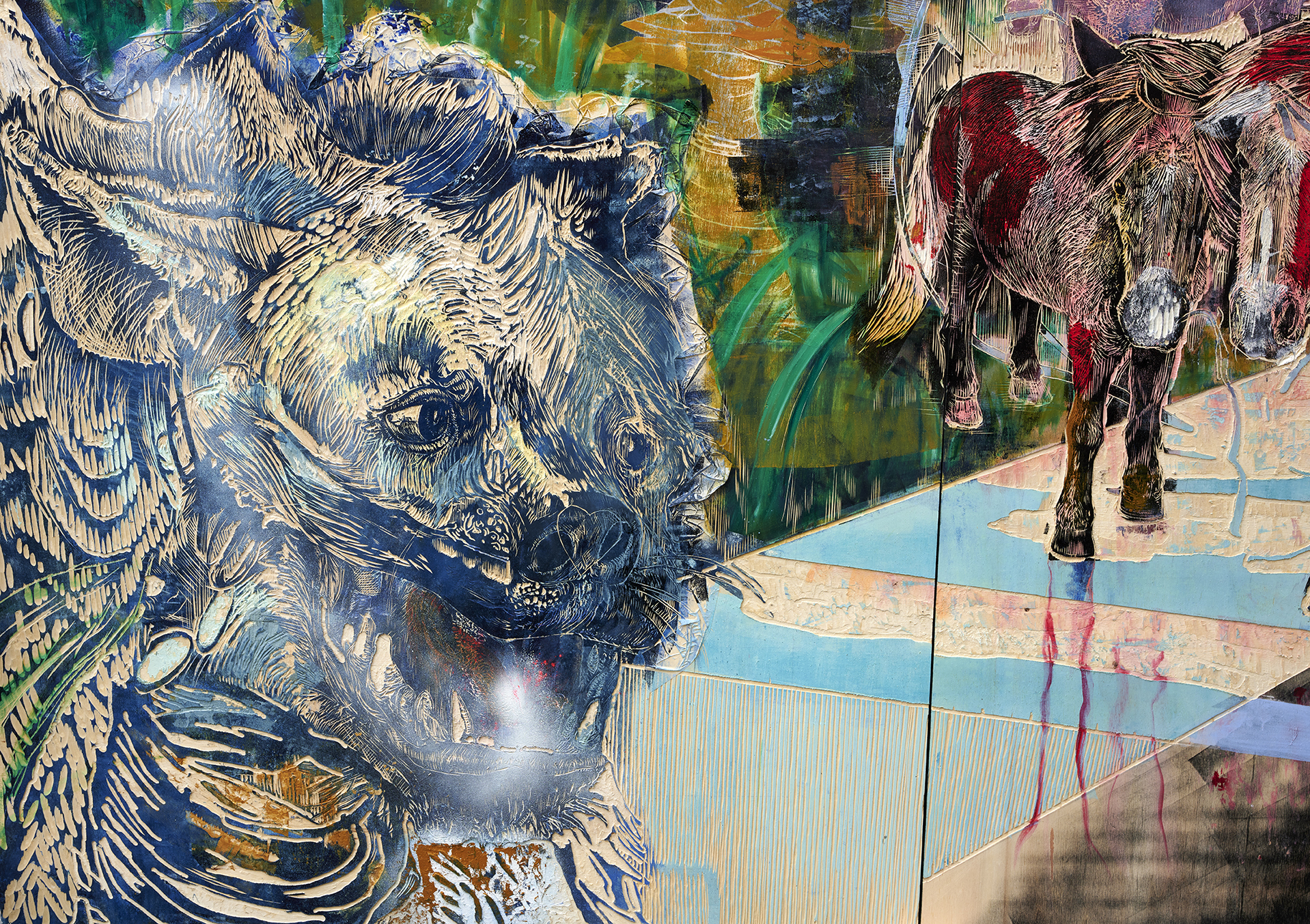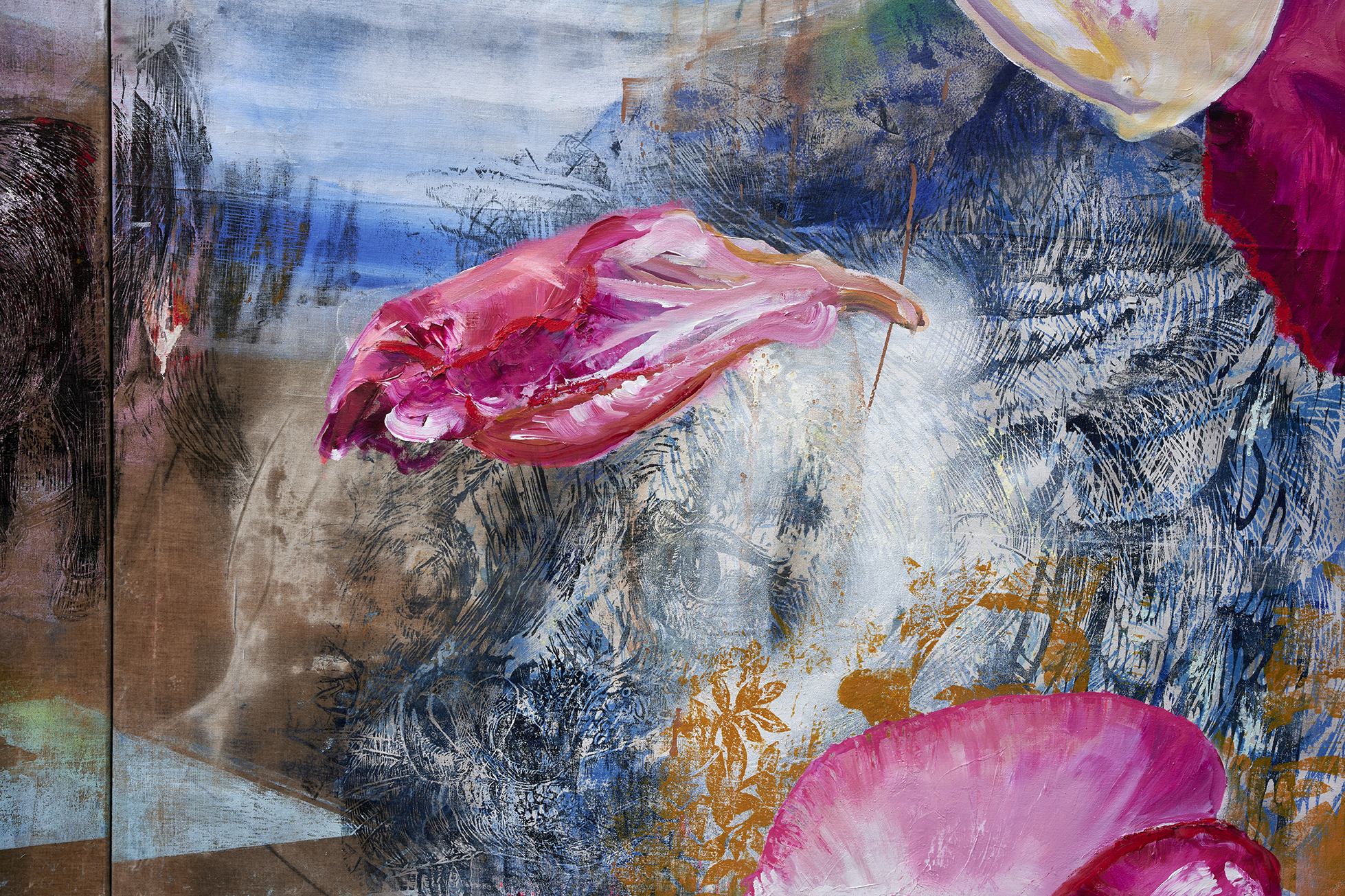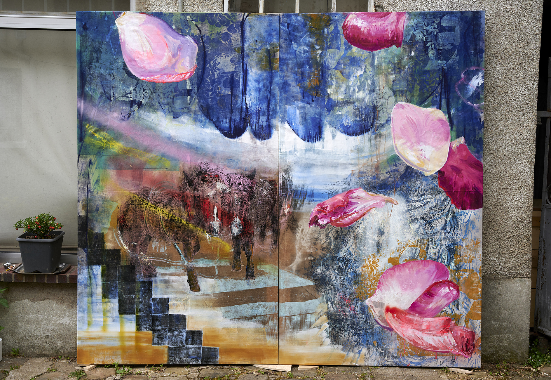 American Beauty (diptyque), 2022 ‧ acrylique, gravure sur bois et paraffine sur toile, 210 × 240 cm