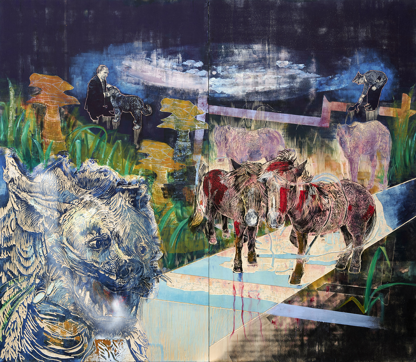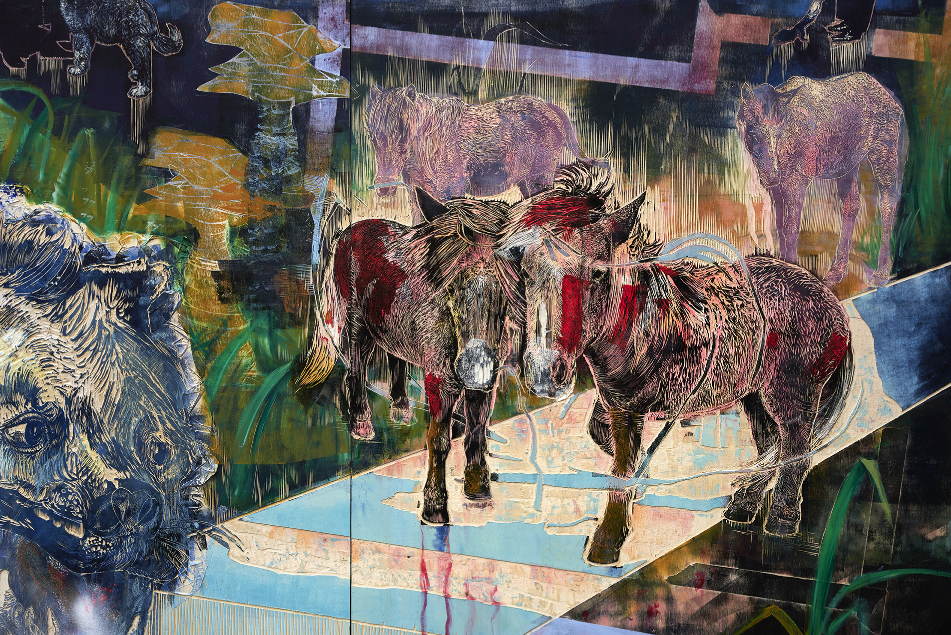 American Night (diptyque), 2022 ‧ huile, encres lithographiques et relief sur bois, 210 × 240 cm