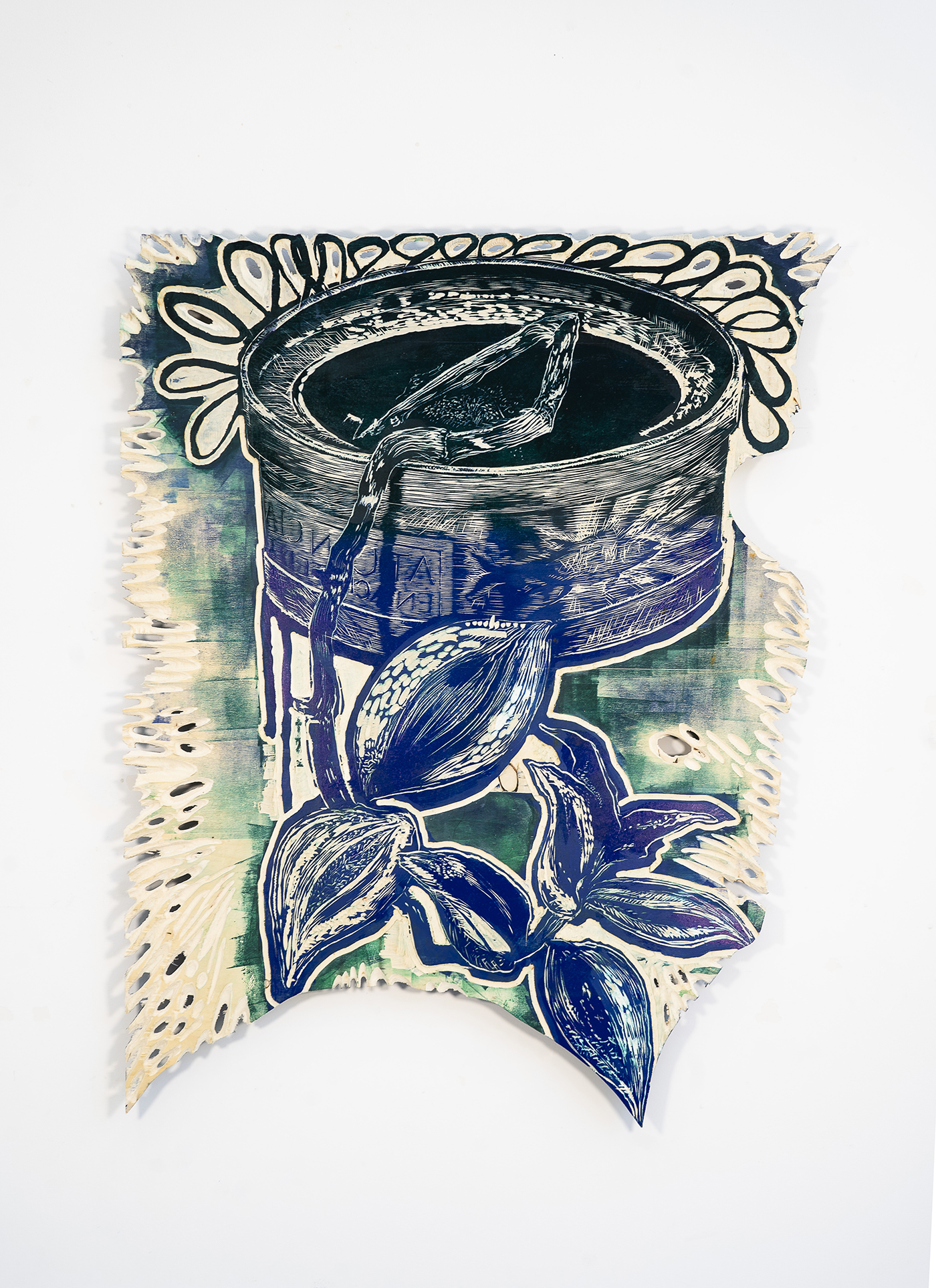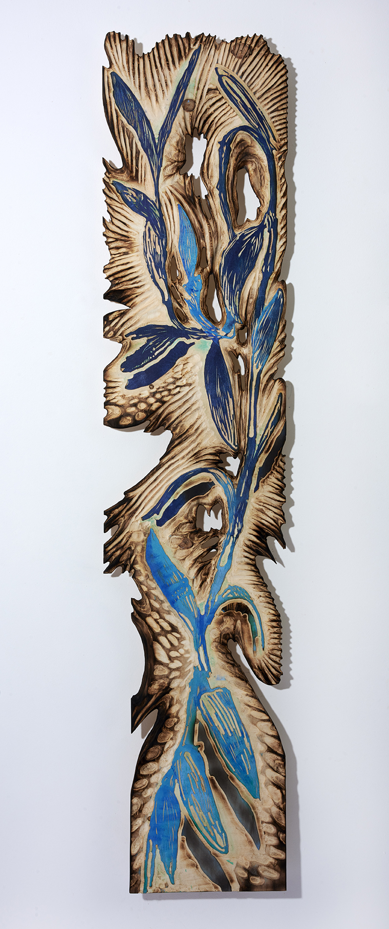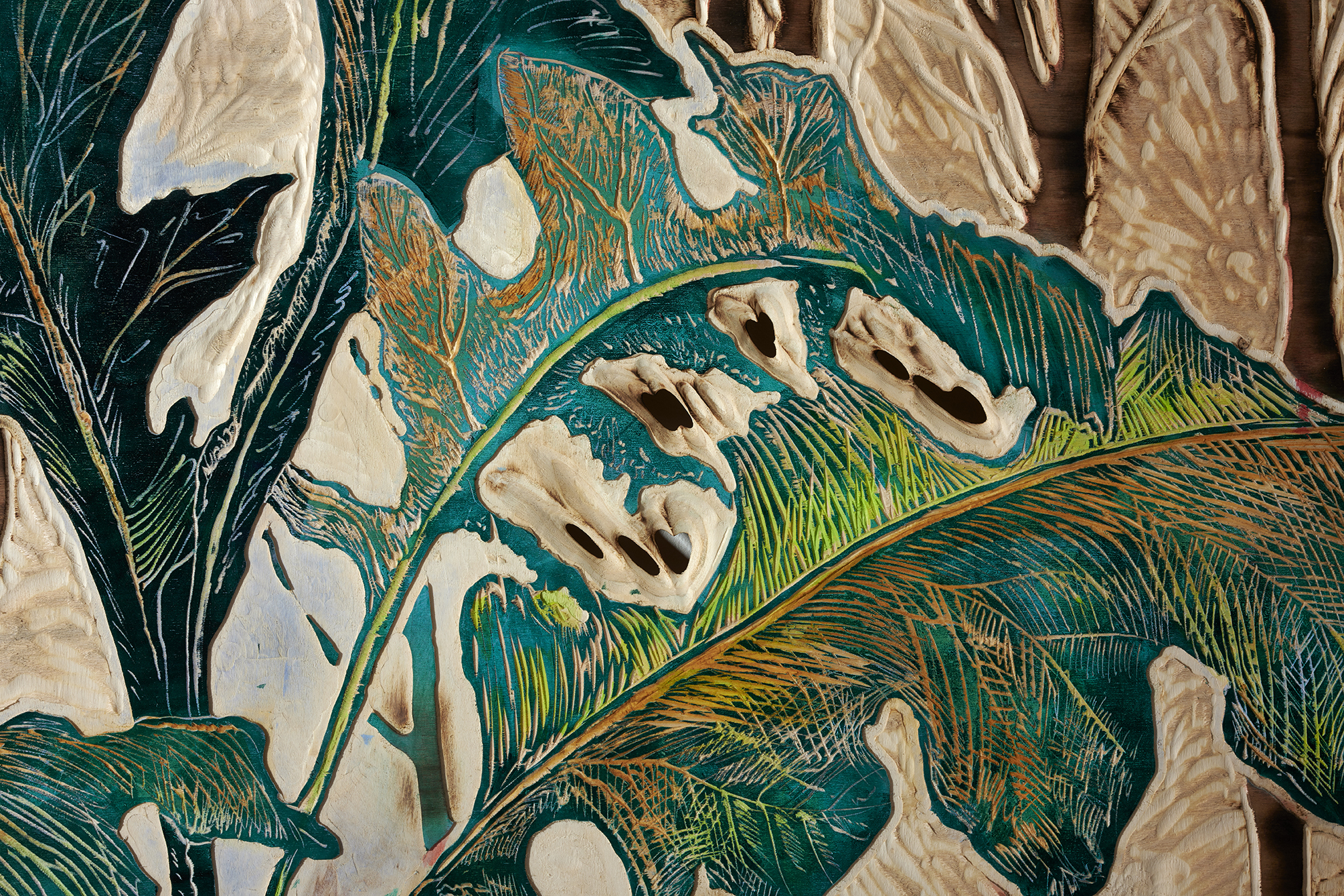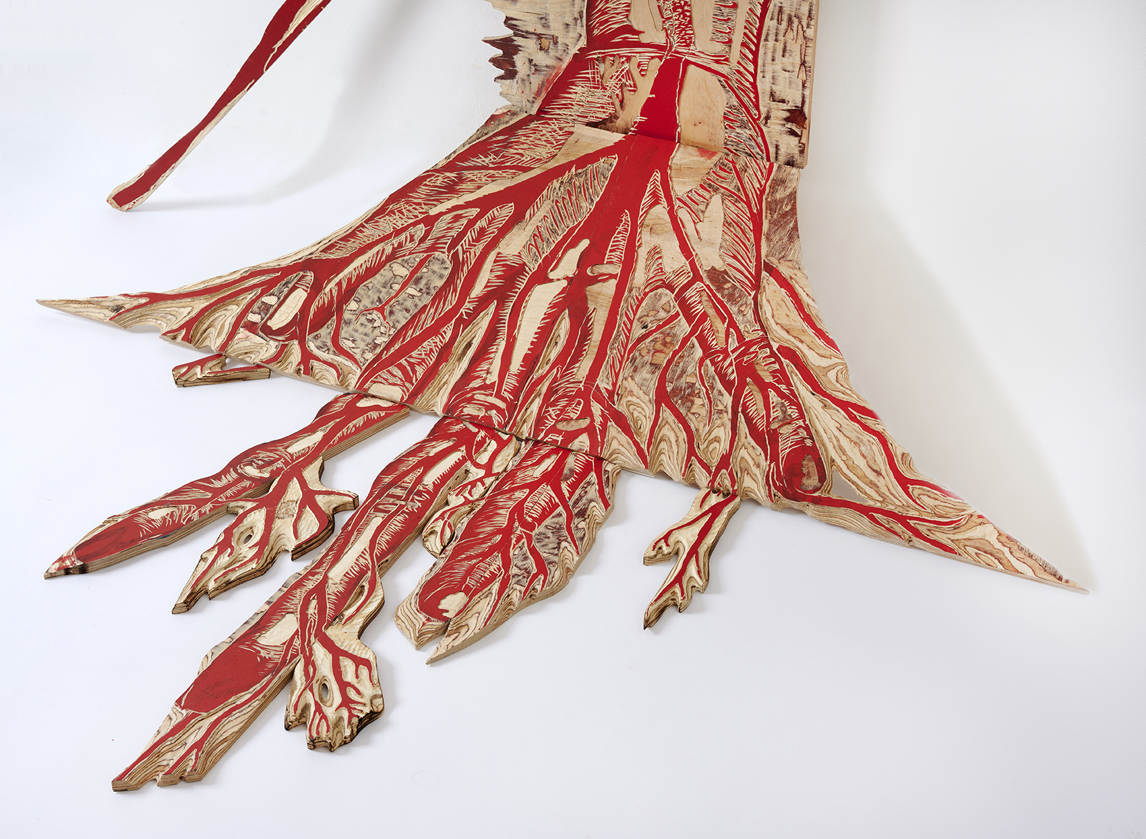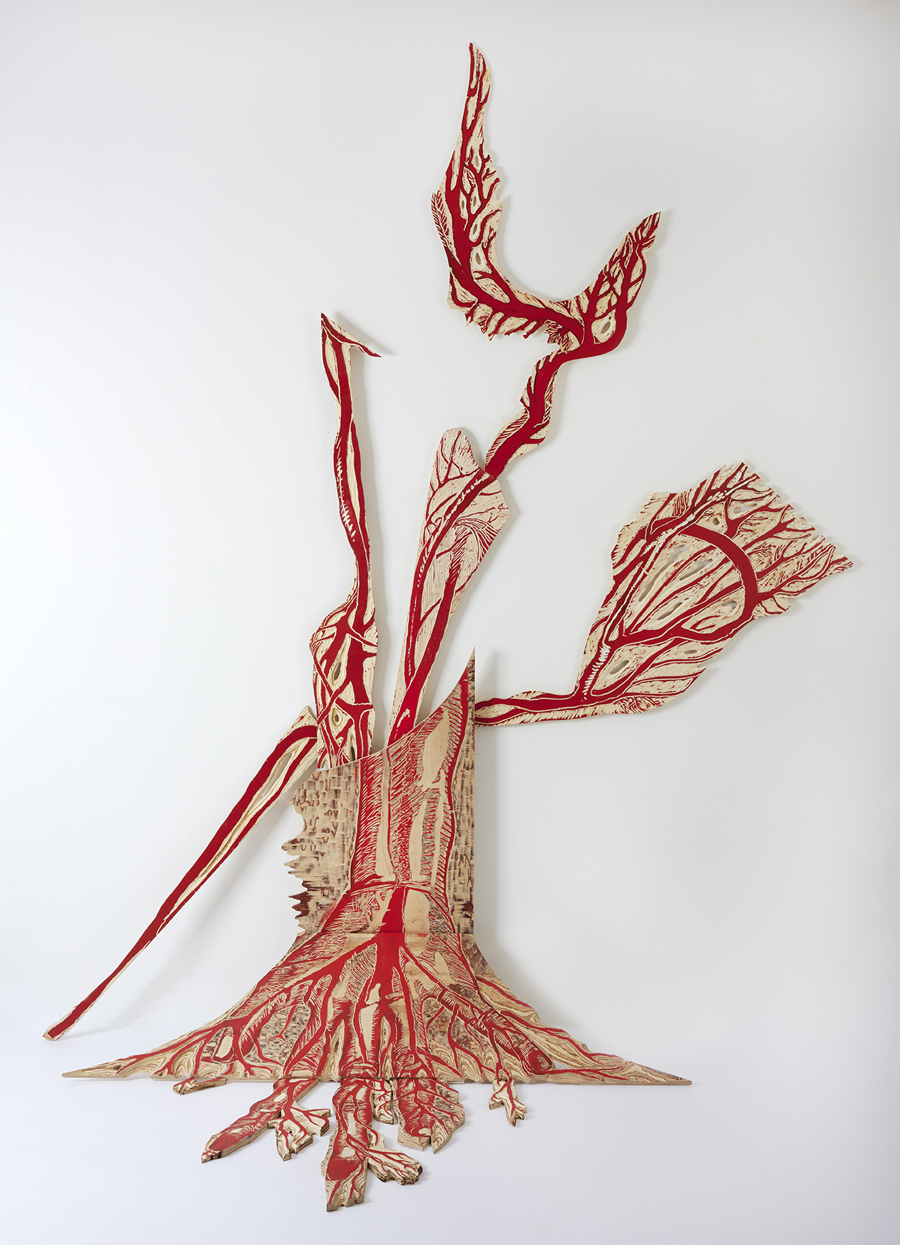 Le processus artistique de Tereza Lochmann est un laboratoire d’expérimentation plastique, qui prend pour point de départ la technique de la gravure sur bois et s’étend vers la peinture, la sculpture et l’installation. Sa manière d’aborder la gravure est profondément corporelle : elle déploie sa pratique dans chaque recoin de l’atelier, des murs au sol, intervenant aussi bien sur la surface que sur le corps du bois. À l’aide de divers outils, elle creuse, coupe, ponce et brûle ce matériau, révélant peu à peu ses couches internes, ses racines. La matrice ainsi générée ne sert pas seulement à imprimer une multitude d’images sur des supports variés, mais devient également une sculpture en soi. (…)